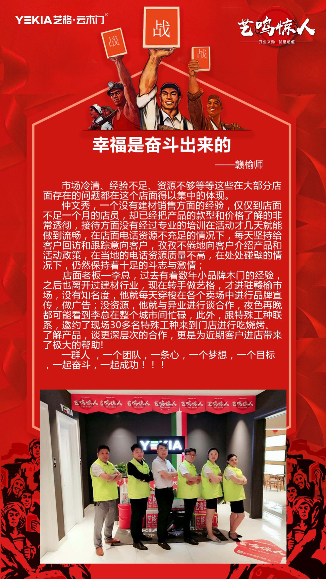 店面老板—李总,过去有着数年小品牌木门的经验,之后也离开过建材行业,现在转手做艺格,才进驻赣榆市场,没有知名度,他就每天穿梭在各个卖场中进行品牌宣传,做广告;没资源,他就与异业进行谈合作,夜色再晚,都可能看到李总在整个城市间忙碌,此外,跟特殊工种联系,邀约了现场30多名特殊工种来到门店进行吃烧烤、了解产品,谈更深层次的合作,更是为近期客户进店带来了极大的帮助!