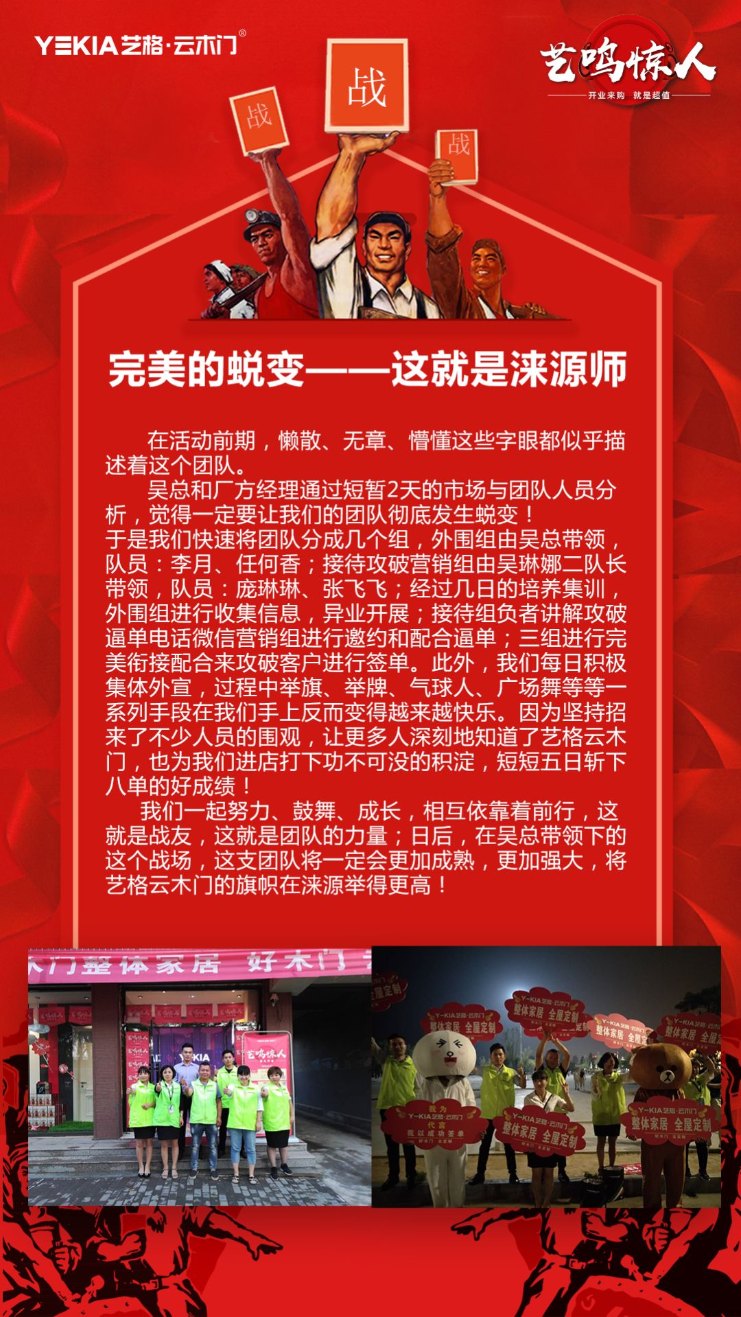 我们一起努力、鼓舞、成长,相互依靠着前行,这就是战友,这就是团队的力量;日后,在吴总带领下的这个战场,这支团队将一定会更加成熟,更加强大,将艺格云木门的旗帜在涞源举得更高!